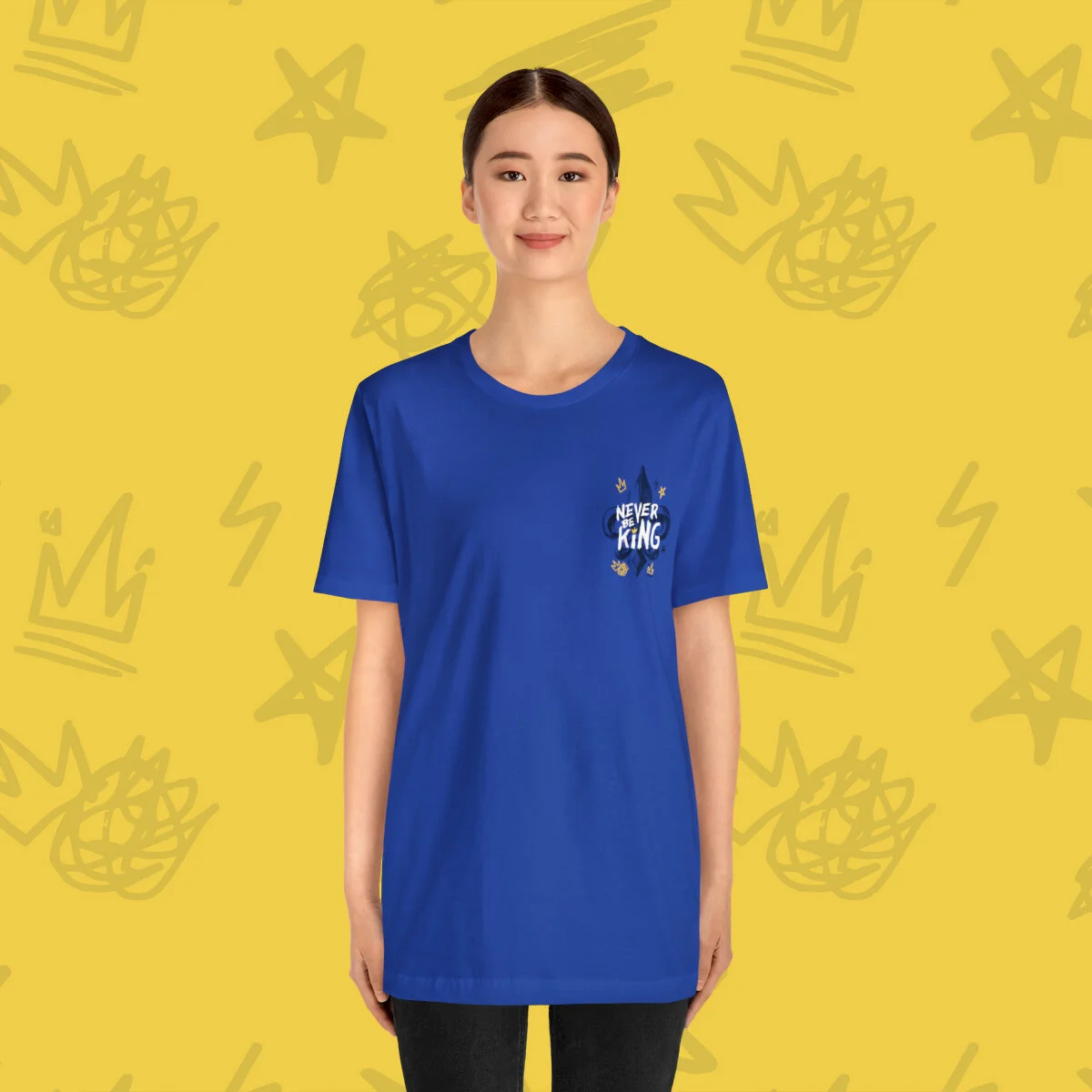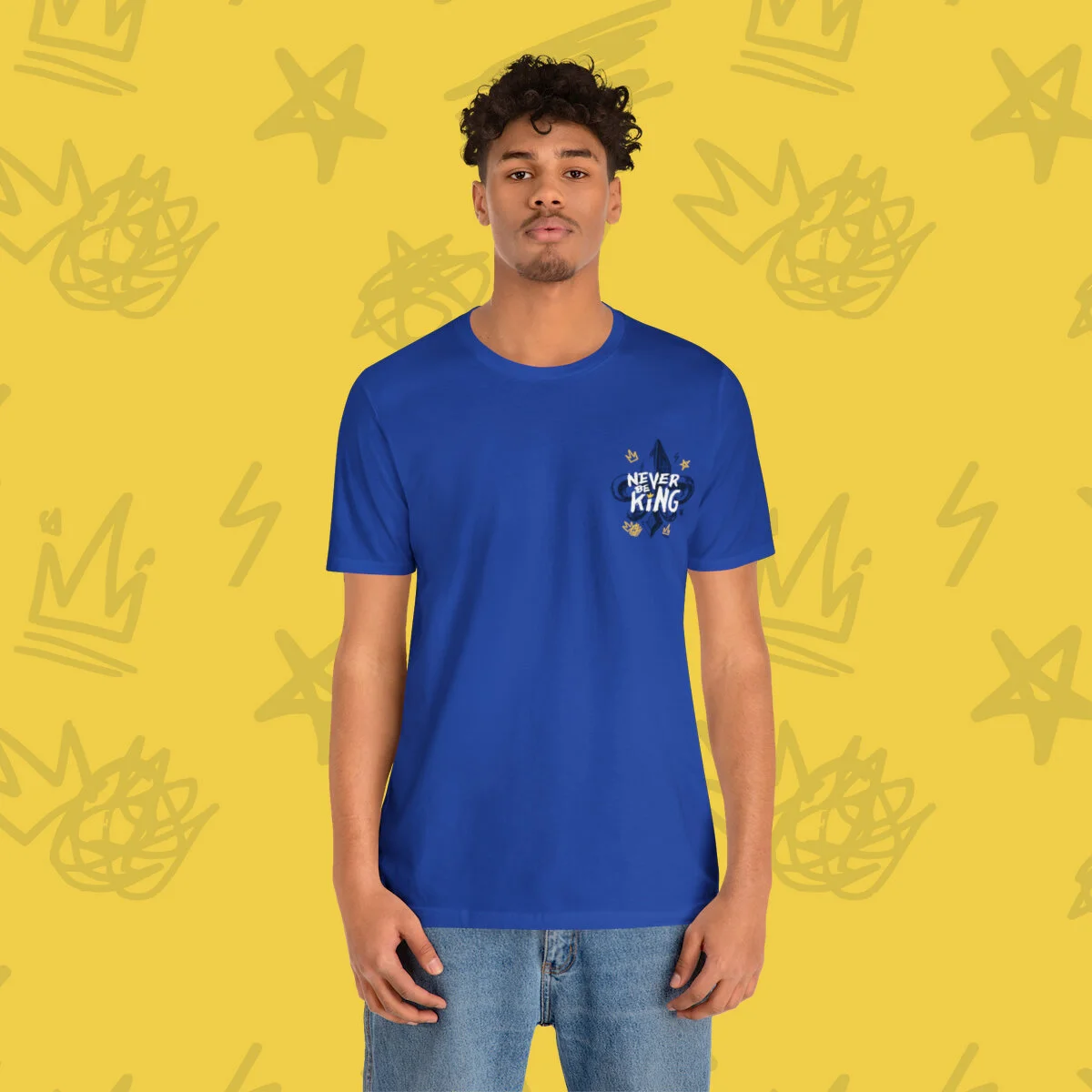 With a comfortabler and modern fit, this Never Be King Logo Unisex Tee displays the show logo on the front. Offered in a Royal Blue color. this logo tee is 90/10, cotton/polyester.